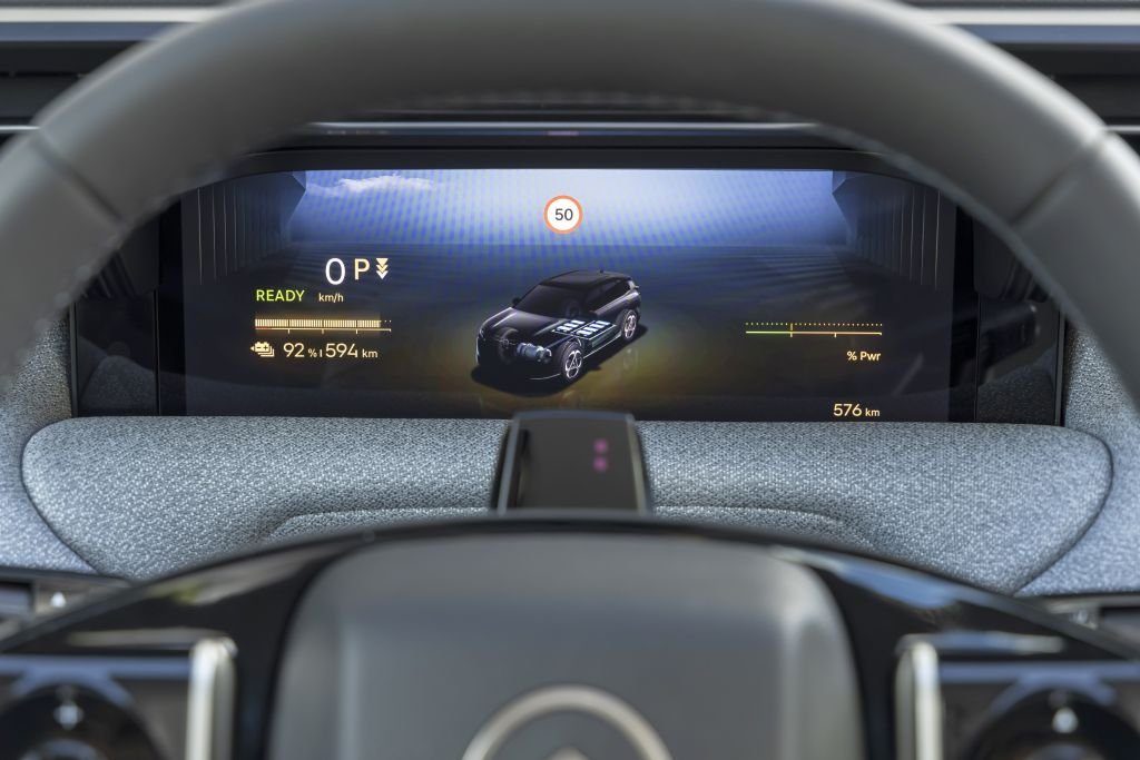 Outras características: modos de condução Normal, Eco e Sport. Travagem regenerativa com três níveis, ajustável por patilhas no volante. Bomba de calor eficiente, bancos e volante aquecidos. Planeador de viagem EV integrado — ajusta a rota em tempo real com base em tráfego, autonomia e pontos de carregamento.