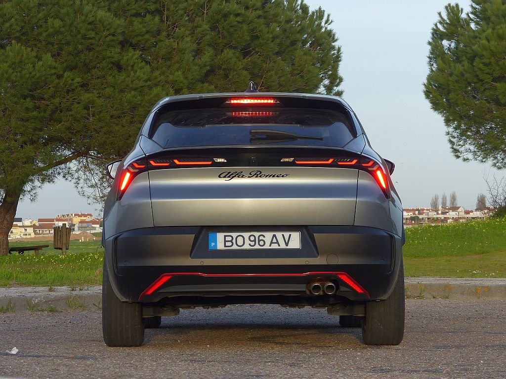 Mas a linguagem estética é marcadamente Alfa Romeo. A grelha triangular, reinterpretada, assume um papel central na identidade do modelo. Os grupos óticos e os recortes laterais introduzem tensão visual, trazendo brilho a zonas mais discretas da carroçaria.