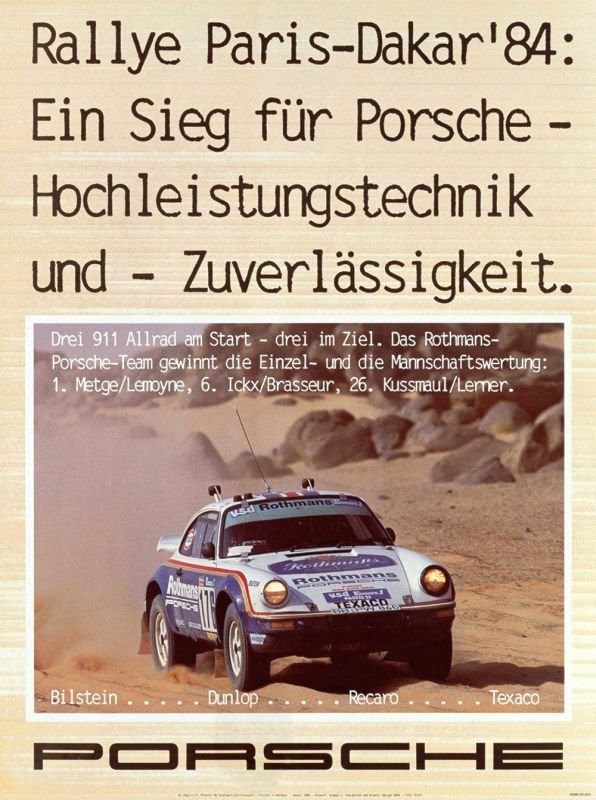 O melhor resultado do Porsche 911 no Dakar foi a vitória geral em 1984, e a evolução direta (Porsche 959, baseado no 911) repetiu a vitória em 1986, conquistando nesse ano também a segunda posição.